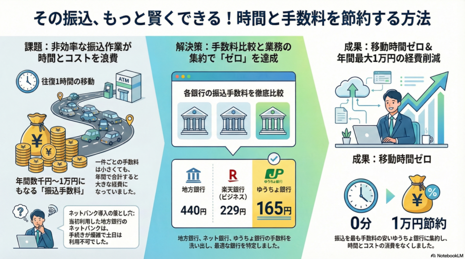 また、地方銀行とゆうちょ銀行の振込手数料の差額は、1件あたり数百円の経費節約になります。