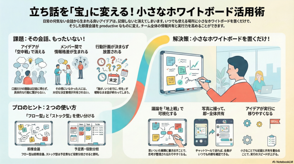 日頃から使ったら消すを習慣化して、いつ即席会議がスタートしても大丈夫なように環境を作り上げておくことが大切です。