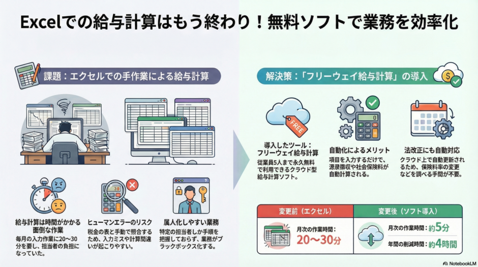 烈火のごとく改善向けて調べ始め、無料の給与ソフト「フリーウェイ給与計算」を発見し、導入しました。
