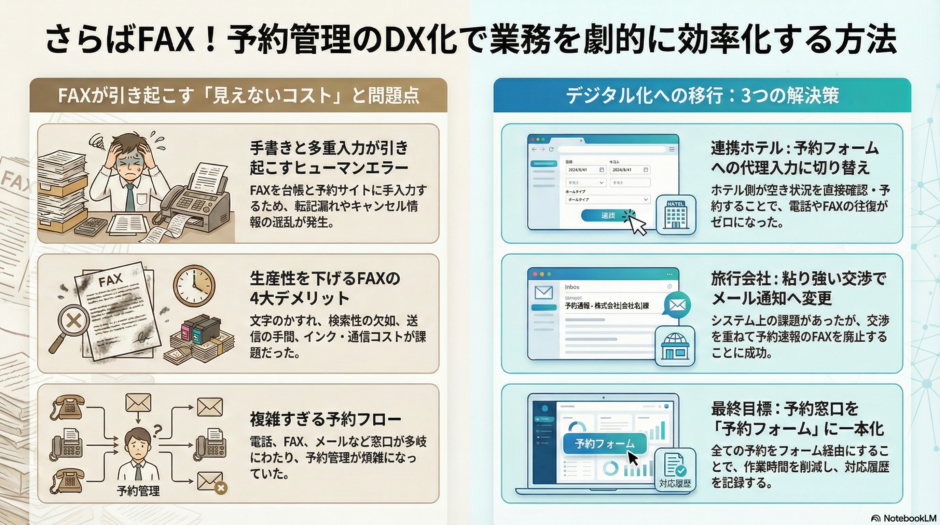 そして、旅行会社からくるツアー予約に関してもFAXを廃止して、よりスムーズな形にする最適解を見つけることができました!