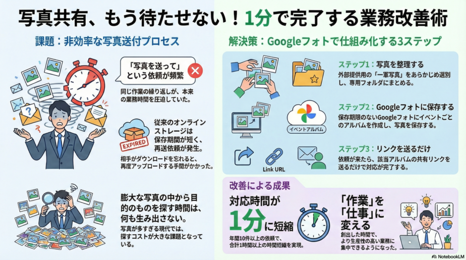 おそらく年間10件以上は「写真を送ってくれ依頼」が舞い込みますが、これで年間1時間程度の時間短縮に成功したのではないでしょうか。