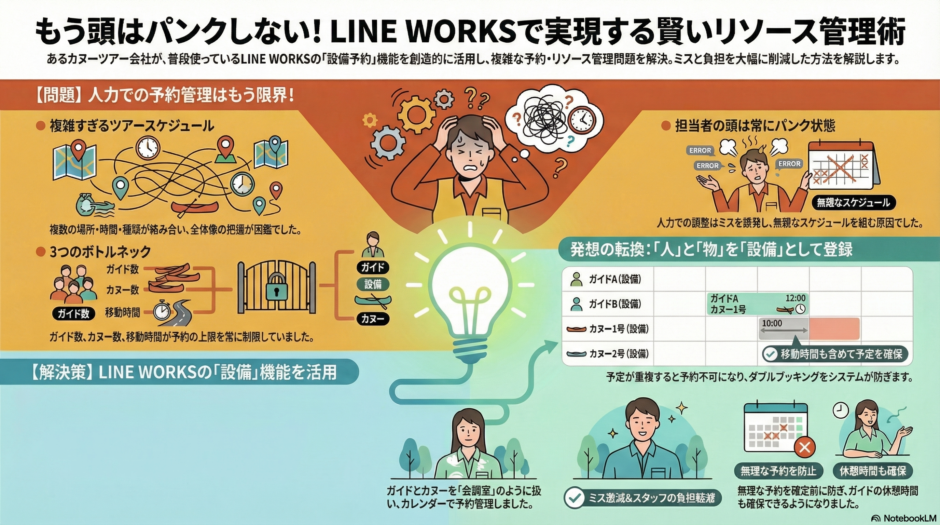 職場での業務カレンダーやグループチャットのために導入したラインワークスに「共有設備」という機能があるではありませんか。