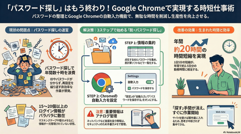 ログインをするときにいちいちパスワードを探すという大変非効率な現状でした。