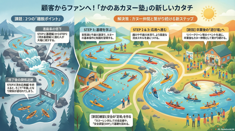 となると次に進みやすい足場掛けの仕組みづくりやカヌー塾を終了してからのビジョンをイメージできる組み立てが必要です!