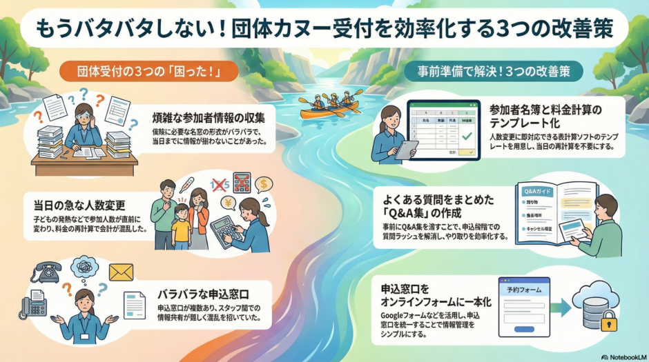 • 団体カヌーで気になることのQ&A集を用意する