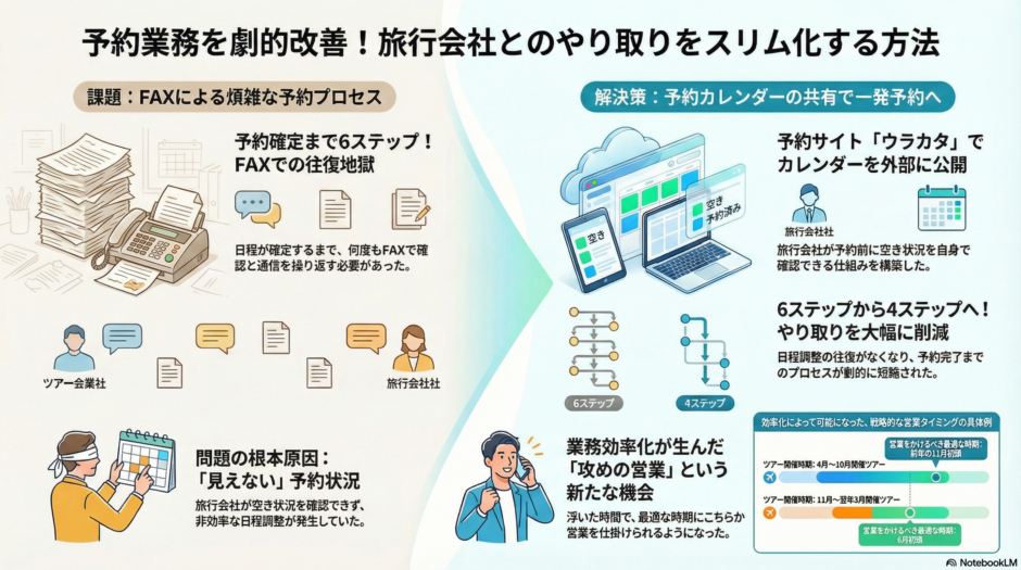 「まず、ご希望の日程が空いているかをこちらでご確認ください」と団体予約のカレンダーのリンクを送り、旅行会社自身で予約枠が空いているか確認してもらい、確定した段階で再度連絡をもらいました。