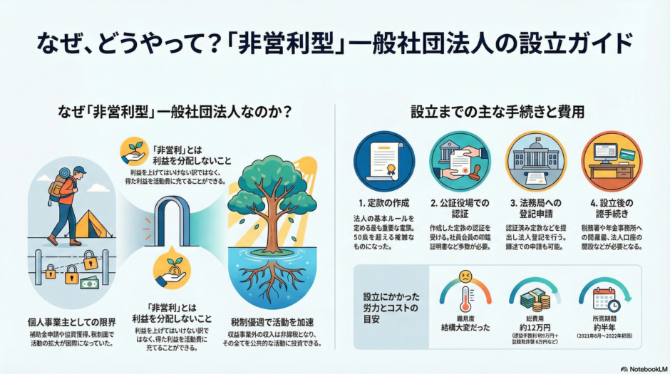 となると法人格を獲得し、補助金・助成金の対象になったり、税制面で優遇される形で活動を進めることができると活動をもっと前進させることができると考えました。