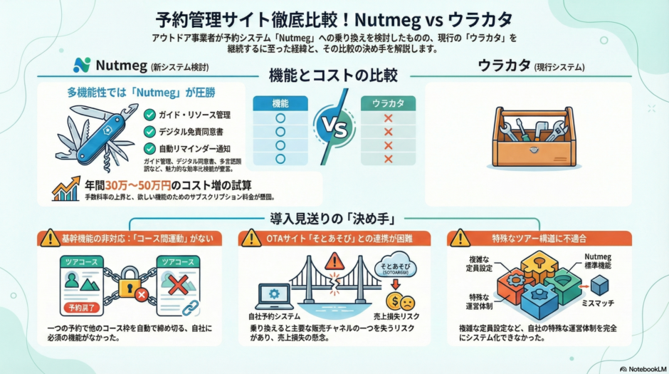 現在ウラカタと在庫連動をしているOTAサイト「そとあそび」ですが、「Nutmeg」に切り替えることでActimとの連動を「そとあそび」自体ができないことから、販売管理の観点で継続が難しそうでした。