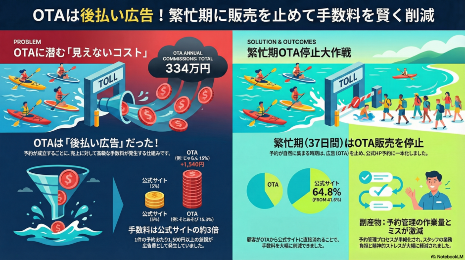 ある日突然OTAが「手数料20%にしま~す」と言われたときにOTAに軸足の体重が乗りすぎていた場合、身動きが取れずにただただ受け入れるしか道がありません。