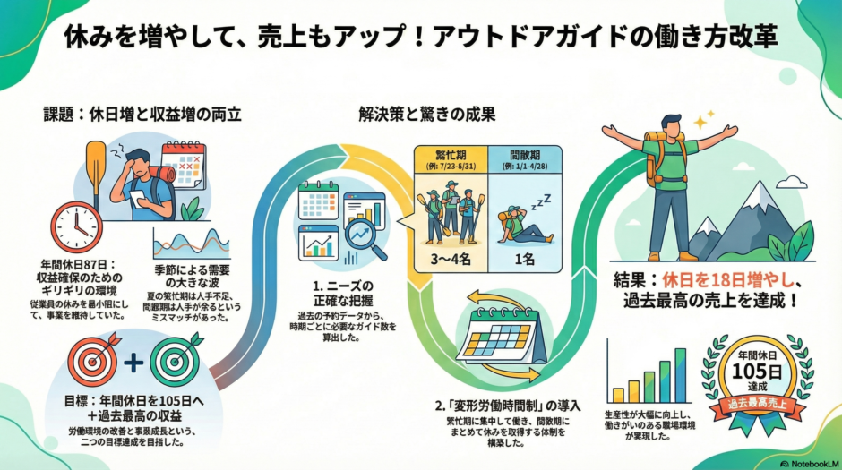 本記事では、春~秋にかけた支笏湖のウォーターアクティビティニーズに合わせたガイドの出勤体制、加えて年間休日105日を実現した労働環境の改善をご紹介したいと思います!