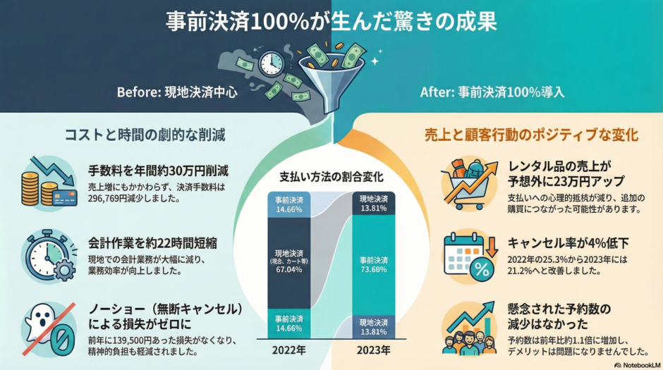 その中で最もわたくし肝いりだったのが「予約は事前決済100%」の改善です。