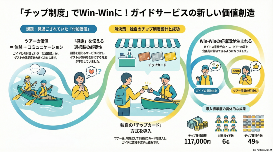 日本のガイドサービスに実験的に「チップ制度」が導入され、「結構な当たり」となった。これは、カヌー体験の本質的価値に加え、ガイドとのコミュニケーションという「付加価値」がゲスト満足度を決定づけるという考えに基づいている。運用面では、事前決済に対応するため、ツアー後に物販として物理的な「チップカード」(3パターン)を購入し、担当ガイドに渡す仕組みを設計。1シーズンでガイド6名が合計117,000円を獲得し、昨年までは生まれていなかった価値提供への対価を得た。この制度は、ゲストは満足すればチップが発生し、ガイドは頑張れば報われるWin-Winの構造を構築し、チップ額はツアーの質を定量的に評価するモチベーション装置となっている。